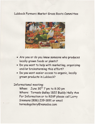 Okay Folks, this Saturday the 12th its DAM time again...the Market will be open and I have a feeling this one will be great. Everyone involved is looking forward to it and wondering how it can get any better, yet it has every month. The Artists and Growers are always stepping up to the plate and never disappointing their customers. The people who come are reconnecting to friends and a better style of life while rediscovering Downtown Lubbock. This Market is a chance for all of us to do something positive for each other while showing the Community that great things can happen when everyone pulls in the same direction. Come on L-Town-lets show people what we're made of!